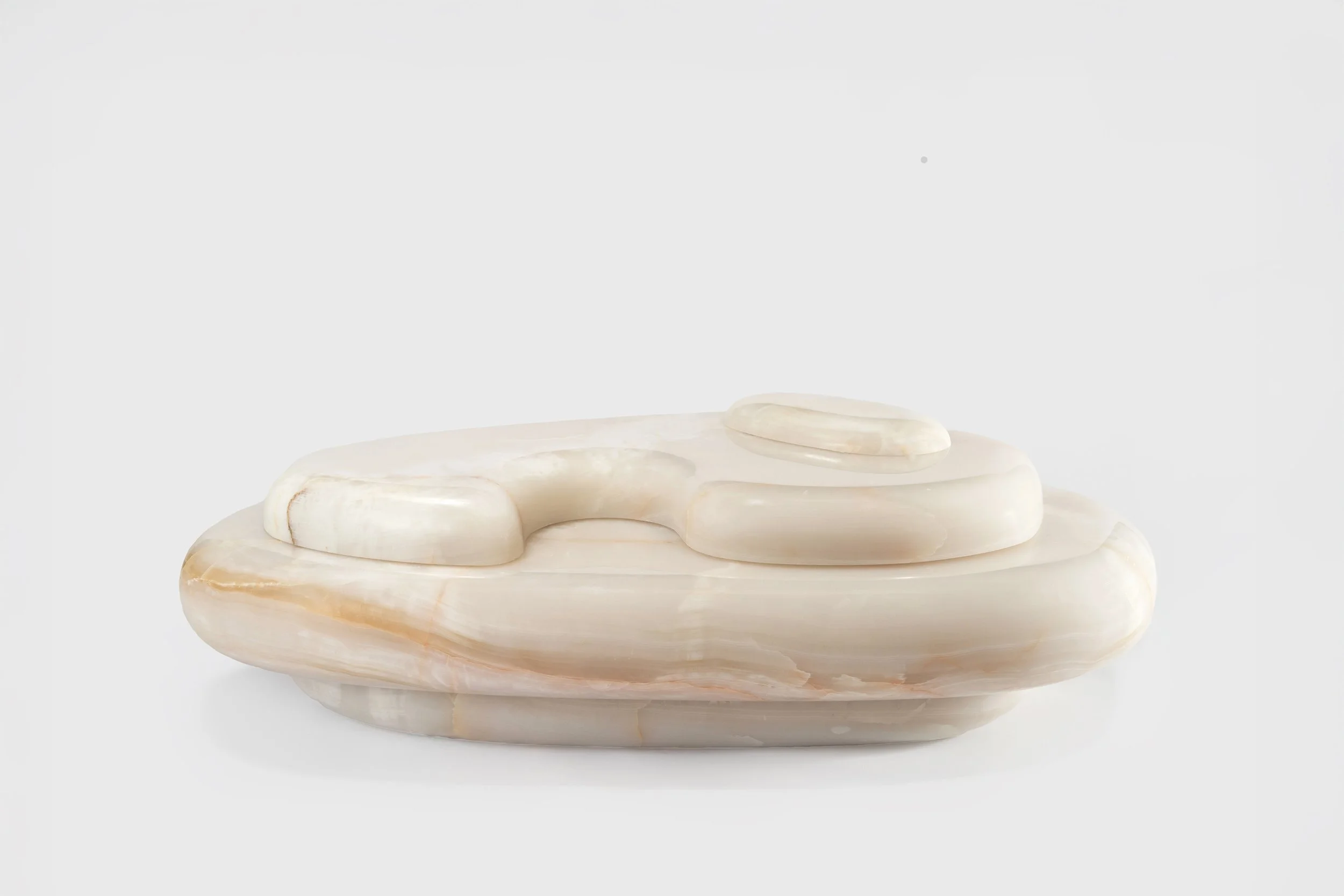 Beautifully Sculpted from unique, veined onyx, this organic low table is more than a piece of furniture; it is a ritual, a reveal, a secret waiting to be discovered.